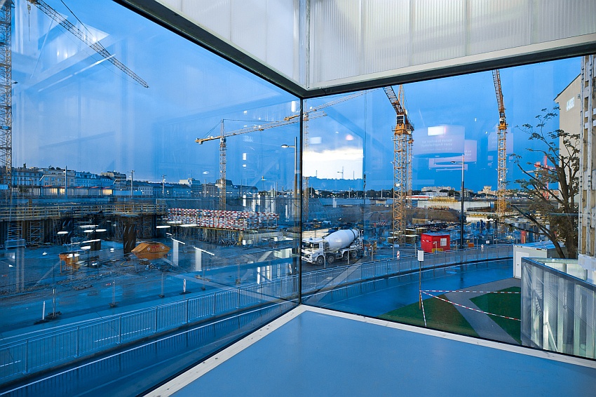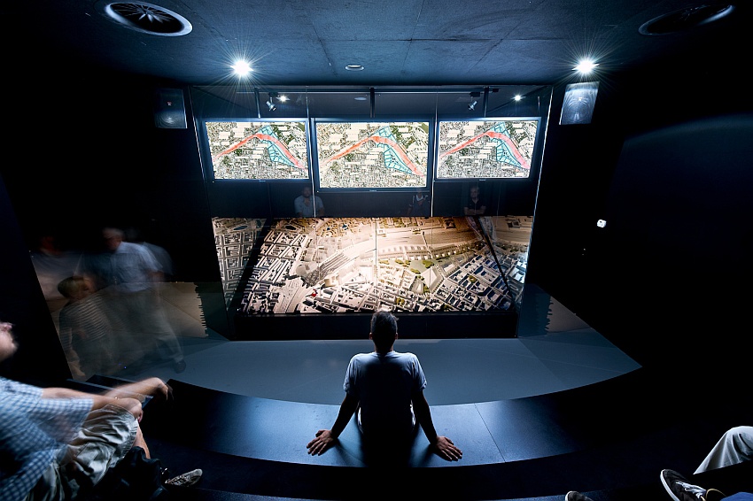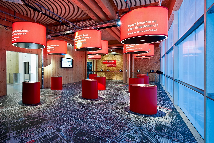 Am Beginn macht ein am Boden ausgebreitetes Luftbild der Stadt den Besucher/innen bewusst, wie groß dieses Stadtentwicklungsgebiet ist. Auf runden Tischen und Banderolen werden Fragen thematisiert, die viele Betroffene im Zusammenhang mit dem Projekt stellen: „Wozu brauchen wir einen Hauptbahnhof?“, „Warum wurde dieser Standort ausgewählt?“, „Und wer bezahlt das alles?“.