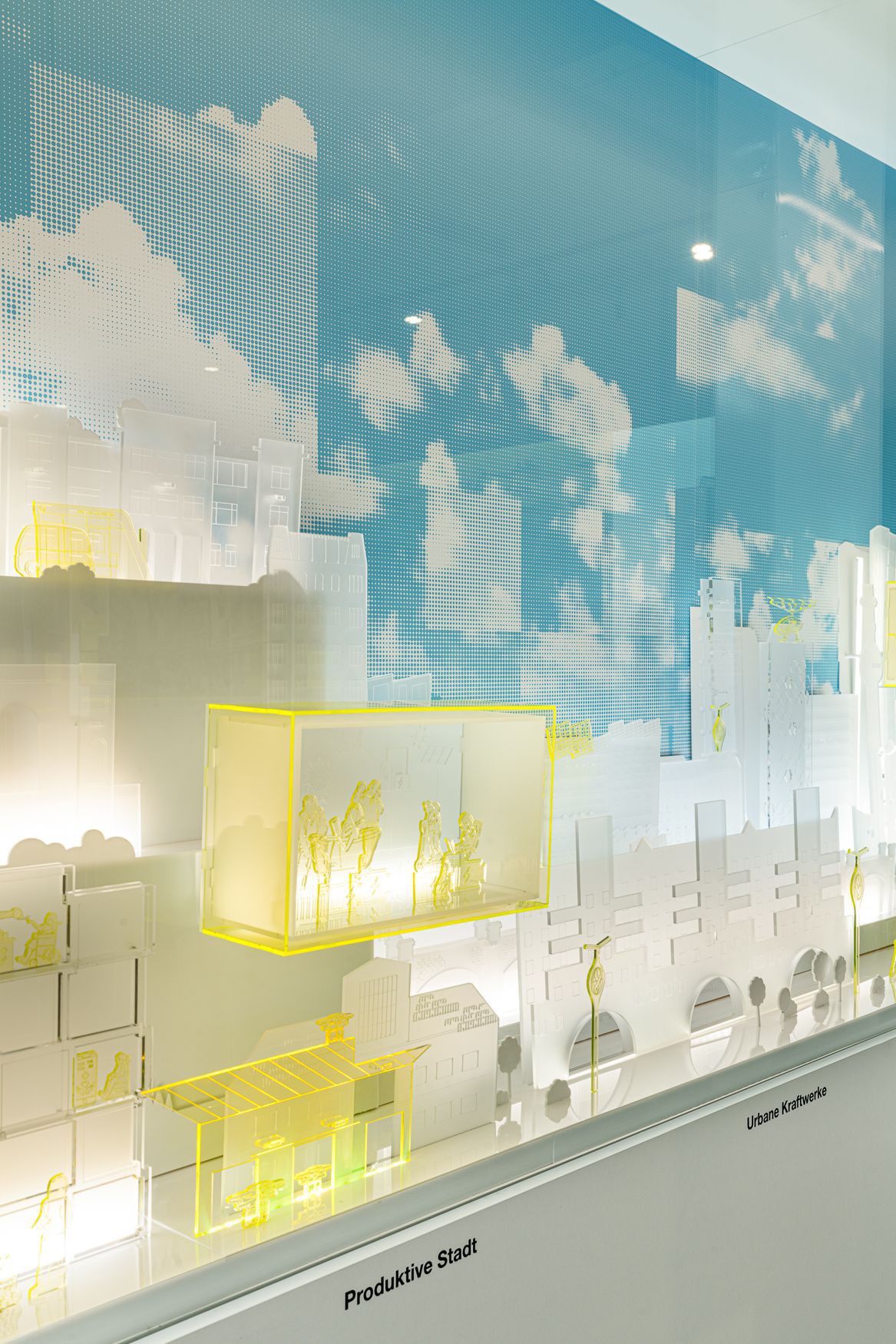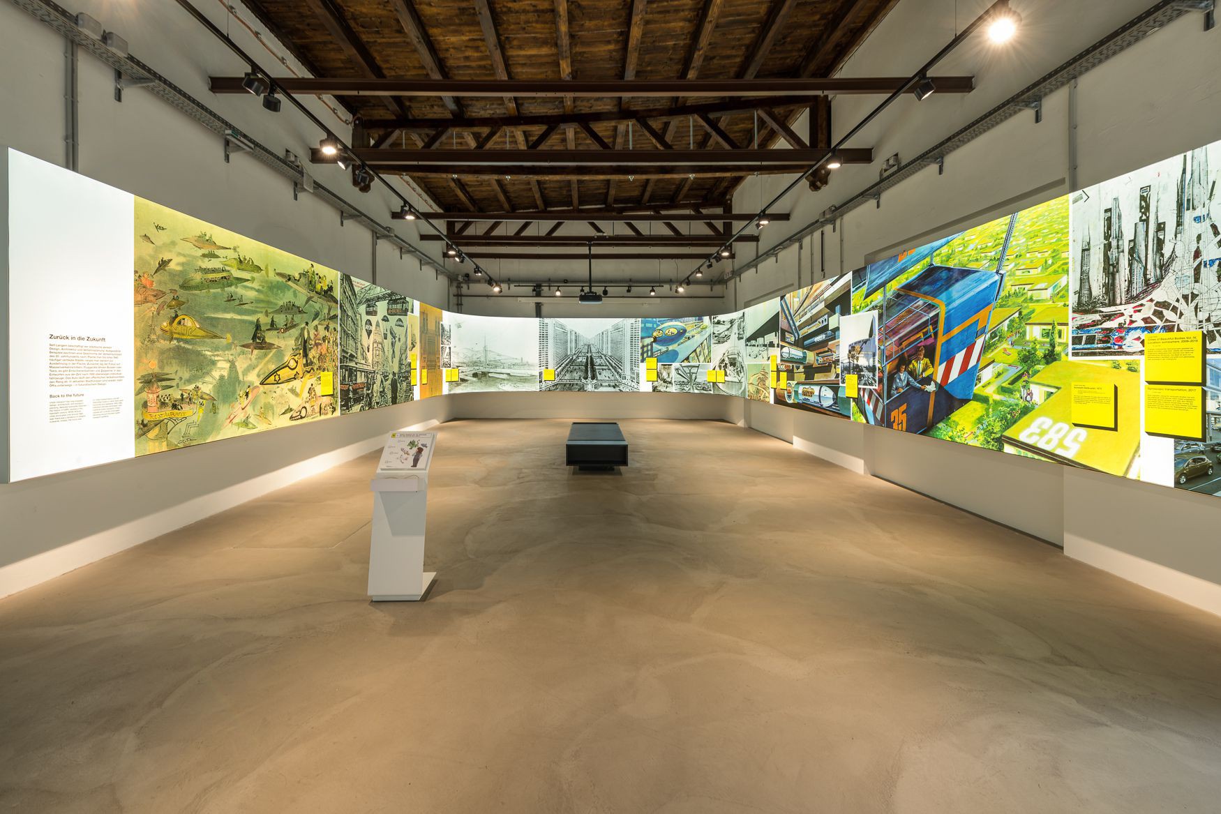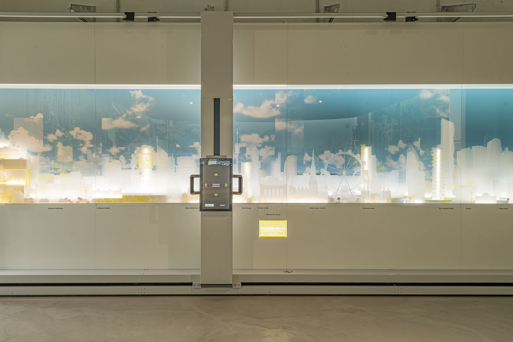 In Modul 16 werden historische Verkehrsutopien an einer hinterleuchteten Wand erlebbar. Eine futuristische Wien-Silhouette entpuppt sich als interaktive Scannerwand mit beweglichen Screens, die Konzepte für die Stadt der Zukunft anschaulich vermitteln.