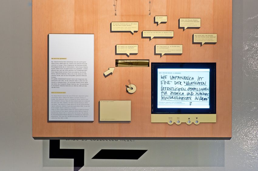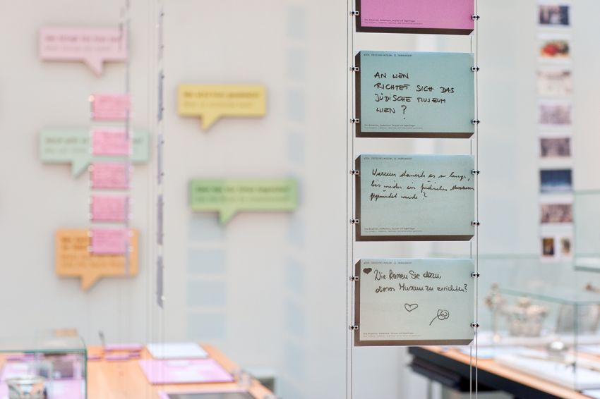 Wir haben die Architekten im Vorfeld inhaltlich und dramaturgisch beraten. Unsere Grundidee war, den museologischen Prozess – das Nachdenken darüber, wie man heute ein Jüdisches Museum in Wien konzipiert – im wörtlichen Sinne „in den Raum“ zu stellen und dabei die Idee des Blogs und des Internetforums zu analogisieren. Fragen und Ideen sollen auf Drahtseilen im Raum kursieren und durch Schieben sowie Ziehen „abgerufen“ werden können. Die Summe der Fragen und Statements füllt die gesamte Raumhöhe aus.