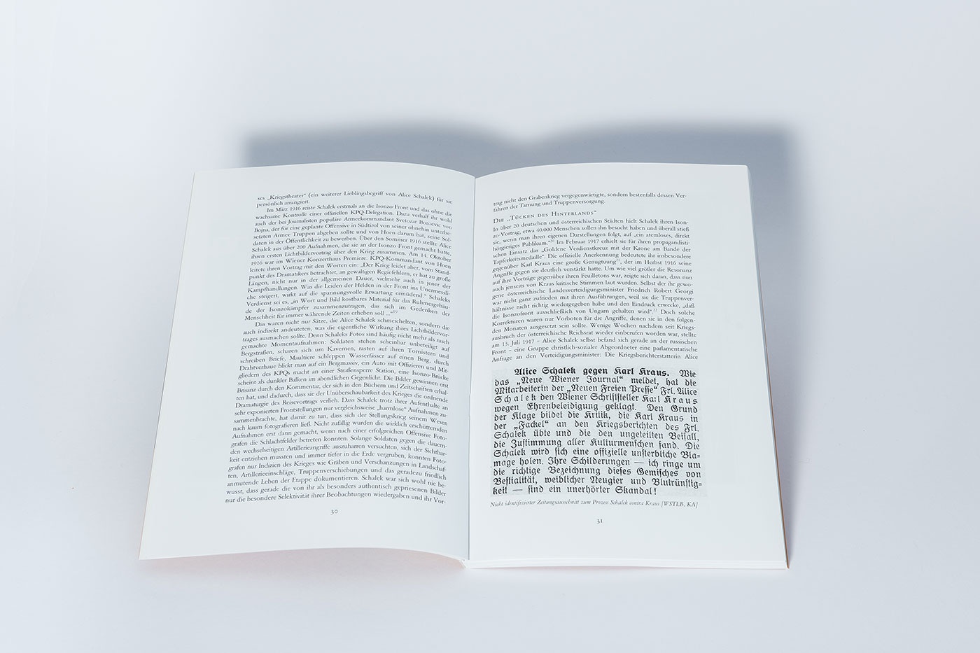 Schon um die Jahrhundertwende sorgte die aus dem jüdischen Bürgertum stammende Alice Schalek in typischen Männerdomänen für beachtliches Aufsehen: als Fotografin, Reporterin und Vortragende. Sie engagierte sich in der internationalen Frauenbewegung und begeisterte sich in der “Neuen Freien Presse” für Weltreisen, Skisport, Bergsteigen und Automobile. Von 1915 bis 1917 fuhr sie im Auftrag des k.u.k. Kriegspressequartiers an die Tiroler Gebirgsfront, zu den Isonzo-Schlachten, nach Serbien und Galizien. Ihre Kriegsbegeisterung demaskierte Karl Kraus in den “Letzten Tagen der Menschheit”.